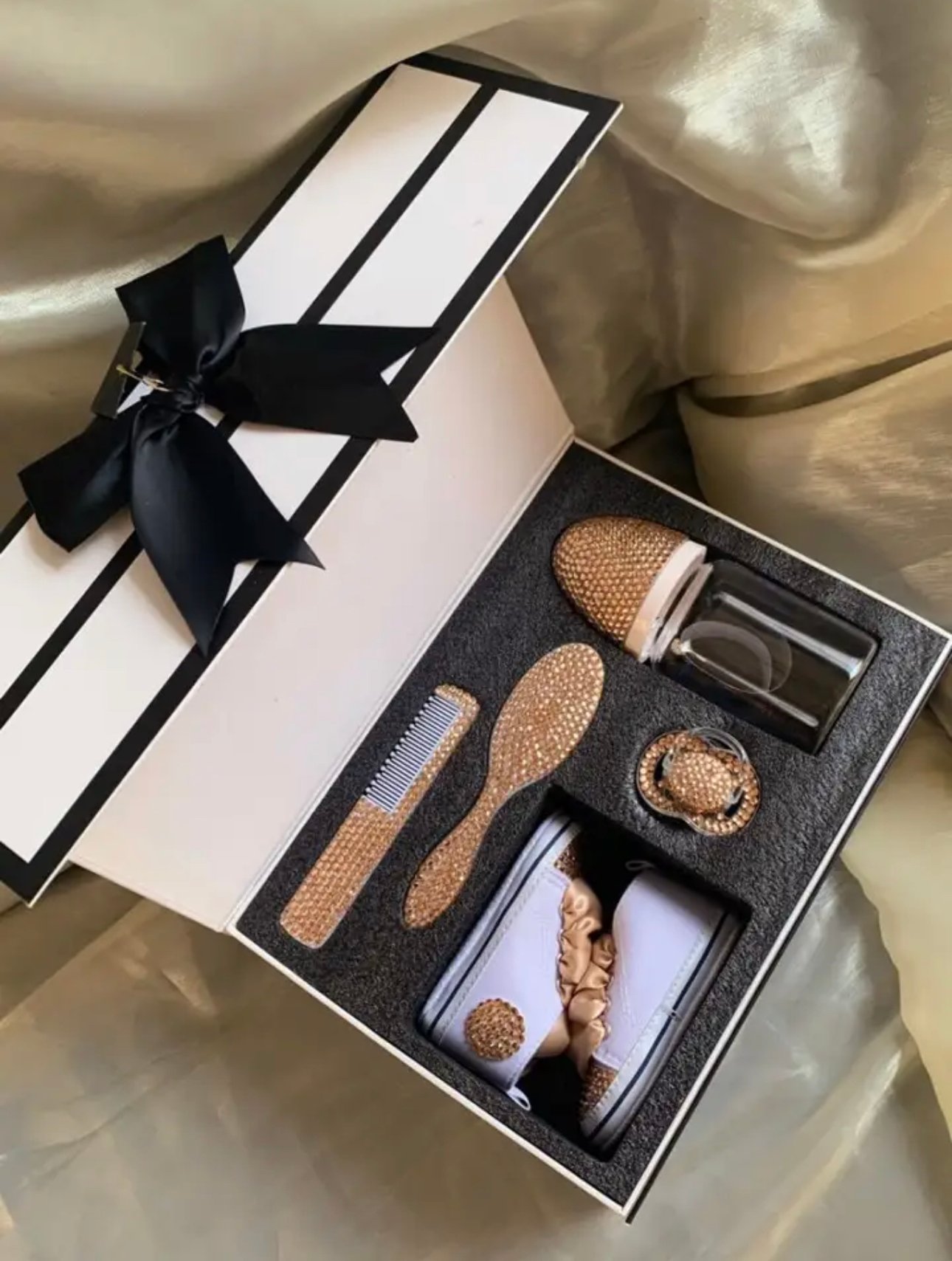 Dollbling Glam Luxury Rhinestones Gold Pacifier Marble Soother Clips gift box pacifier bottle hair brush comb and baby shoes😍